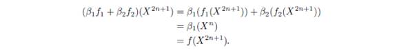 Do mesmo modo, calculando (β1f1 + β2f2)(X2n) vemos que coincide com f(X2n). Assim, por linearidade, temos que f = β1f1 + β2f2. Portanto, {f1,f2} gera A. Logo, {f1,f2} e uma base de A.