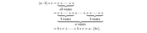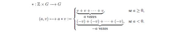 Com essa operacao temos que G e um Z-módulo. Vamos provar a propriedade 2 e as demais ficam para o leitor. Para todo a e b em z e v, v1 e v2 em G, temos dois casos a analisar: a · b ≥ 0 ou a · b < 0. Se a · b ≥ 0, entao a,b ≥ 0 ou a,b < 0. Quando a,b ≥ 0 (se a,b < 0, entao −ab > 0)