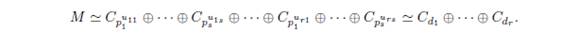 formando um conjunto completo de relacoes de M. Agora, seja Cj o subgrupo cíclico gerado por vj, para 1 ≤ j ≤ m. Entao, Cj e cíclico de ordem dj se j ≤ r e Cj e cíclico infinito se j > r.