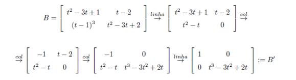 Teorema 5.1. Sejam A = K[t] o anel de polinomios na variavel t sobre um corpo K e B uma A-matriz de tamanho m × n. Existem matrizes P e Q, produto de A-matrizes elementares, tal que B' = Q−1BP e diagonal, sendo que cada entrada nao nula da diagonal di de B' e um polinomio monico, e ainda d1|d2 ...|dk.