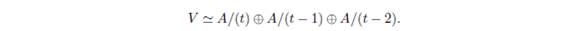 Voltando ao exemplo 5.1, com A = Q[t], o A-módulo V apresentado pela matriz B e isomorfo ao módulo apresentado pela matriz B' que segundo a propriedade (2.1) obtemos V A/(f). Mas como os fatores t,t − 1,t − 2 sao polinomios irredutıveis sobre Q os mesmos sao relativamente primos e entao