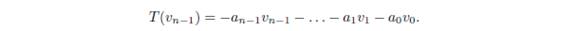 e portanto o conjunto {1,t,...,tm−1} e uma base de K[t]/(f) como K[t]-modulo, consequentemente o conjunto β = {v,tv,...,tm−1v0} e uma base de V como K-espac¸o vetorial. Considerando T o operador multiplicacao por t definido em (5.1), ao escrevermos os vetores da base β da forma (v0,v1,...,vn−1), onde vi = Ti(v0), temos