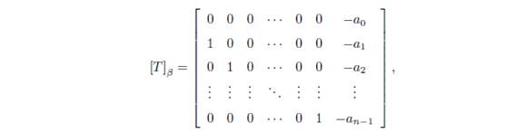 Teorema 5.3. Seja T um operador linear em um espaco vetorial de dimensao finita V sobre um corpo K. Existe uma base para V tal que a matriz de T e composta de blocos do tipo descrito acima. Essa matriz e chamada de forma canónica racional do operador T.