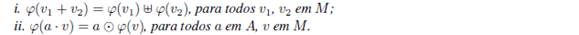 Definicao 2.4. Sejam (M,+) e (M0,]) dois A-módulos. Uma aplicacao ϕ : M → M0 e homomorfismo de A-módulos ou um A-homomorfismo se para todos a em A, v1,v2 em M temos que :