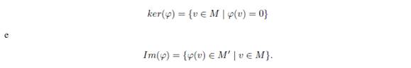 Definicao 2.6. Dado um homomorfismo de A-módulos ϕ : M → M', definimos o núcleo de ϕ e a imagem de ϕ, respectivamente, como os seguinte conjuntos: