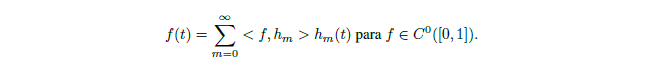 Remarcamos aún que las sumas parciales Smf(t) =< f, h0 > h0(t) + ...+ < f, hm > hm(t) aproximan f(t) vía funciones que son constantes sobre intervalos (función escalera). El trabajo de Haar fue el inicio de una serie de esfuerzos hechos a fin de corregir defectos cuando se trabaja en espacios más generales o de diferentes tipos. Esto es una interesante historia en la teoría de bases y de espacios de funciones. Así, si f ∈ C1([0,1]), los h’ms no son apropiados, un avance fue logrado por Faber y Schauder en el periodo 1910-20. así, parten de la función
