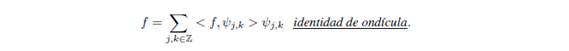 La identidad de ondícula nos dice que la señal f es descompuesta en sus componentes, a diferentes escalas 1/2j, y centradas en diferentes ubicaciones k/2j , para j,k ∈ Z.