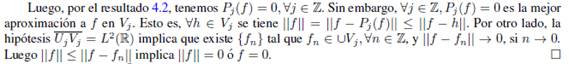 De esta manera, si f ∈ L2(R) tal que < f,ψj,k >= 0,∀j,k ∈ Z (esto es, f ⊥ Wj,∀j ∈ Z), debemos probar que f = 0. En efecto, para cada j ∈ Z sea Pj : L2(R) → Vj el operador proyección; así, Pj(f) es la proyección de f sobre el subespacio cerrado Vj. Luego, Pj(f) = ∑k∈Z < f,ϕj,k > ϕj,k. Sabemos que Pj(f) ∈ Vj y (f − Pj(f)) ⊥ Vj. Si l ≤ j − 1 entonces Wl ⊂ Vl+1 ⊆ Vj. Luego, (f − Pj(f)) ⊥ Wf, ∀l ≤ j − 1. Desde que f ⊥ Wl,∀l, la linealidad implica que Pj(f) ⊥ Wl,∀l ≤ j − 1.