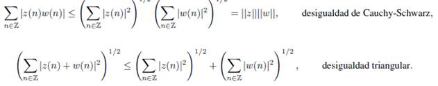 Así, l2(Z) es un espacio normado, también un espacio métrico con la métrica d(z,w) = ||z − w||. Para muchos propósitos son útiles las desigualdades: