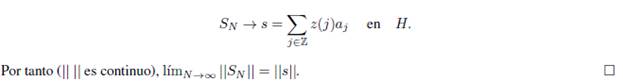 Desde que H es completo, (SN)N ∈ N es convergente en H, esto es: ∑j∈Z z(j)aj converge en H.