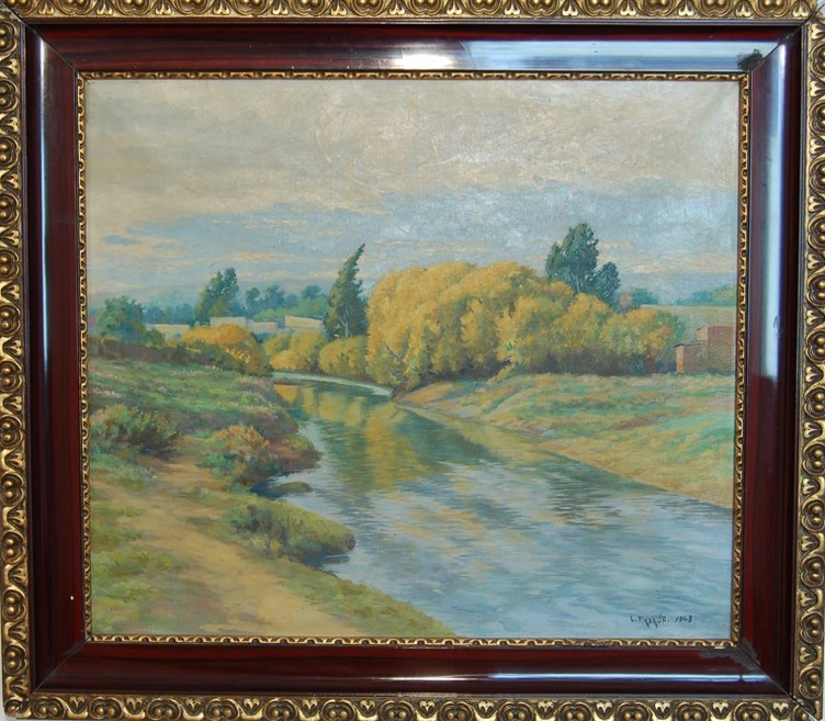 Alfredo MaseraEn términos plásticos, la vinculación entre paisaje y representación regional tematizó el sudoeste de la provincia de Buenos Aires y la región lacustre cordillerana en manifestaciones líricas que, en obras como las de Pronsato, Alfredo Masera (Imagen 3) o Antonio Bagué, apelaban a la expresividad del color empastado y vibrante. En casos como el de Bruno Petracci o Lorenzo Padrón, en cambio, la paleta sobria, tenue y amable se combinó con las estrategias del dibujo y la ilusión de la tridimensionalidad espacial para construir una iconografía de las áreas periféricas a la ciudad: “Bahía Blanca en el 40” (1940)pareciera ser poco más que un caserío polvoriento, pequeño frente a la inmensidad del cielo y la extensión de la tierra, mientras que el “Arroyo Napostá”[43]discurre ancho y tranquilo entre tamariscos y arbustos, casi indiferente a la presencia humana(imagen 4). La relación entre cultura y naturaleza oscila, en este sentido, entre lo sublime y lo pintoresco, lo que impacta y conmueve y lo que resulta ajenamente curioso, es decir, entre categorías decimonónicas románticas ligadas a la experiencia emocional, al placer y al sentimiento.