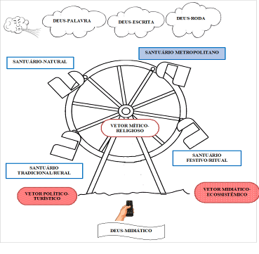 A metáfora da roda-gigante nos transporta para o movimento de vida e de morte, do alto e do baixo, de perto e de longe, do céu e da terra, o que os torna cruciais para os processos psicológicos, emocionais, afetivos, religiosos, sociais e culturais desenvolvidos pelos santuários. Conforme a roda vai se movendo, novas paisagens e experiências vão surgindo ao longo do horizonte, acima das nossas cabeças ou debaixo dos nossos pés. Interseccionada às categorizações, alertamos para os perigos do “imaginário-congelante”. Assim, não há hegemonias ou categorias pré-estabelecidas, mas, sim, a disposição e a combinação dos espaços com possibilidades operacionais, estéticas, simbólicas e poéticas.