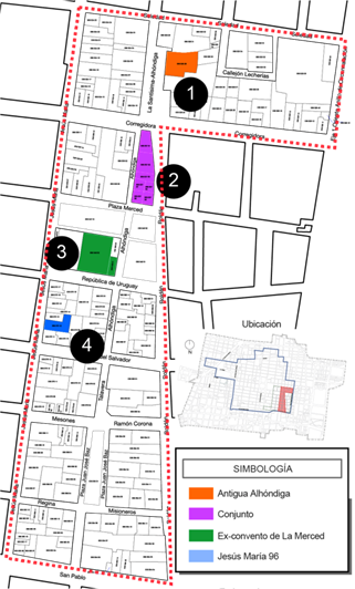 Para el estudio se escogieron 4 edificaciones dentro de La Merced, uno de los barrios tradicionales del Centro Histórico de Ciudad de México que ha sido objeto de sucesivas intervenciones en las últimas décadas (Ver mapa 1 e figura 2). En el área se encuentran 185 predios dentro de las 18 manzanas que componen el área de estudio; de éstos, 91 tienen Nivel de Protección 1, otros 23 cuentan con Nivel de Protección 2 y finalmente, existen 7 predios con Nivel de Protección 3[vii]. Los restantes 64 predios no tienen ningún nivel de protección; por consiguiente, desde el discurso autorizado se considera que casi el 60% de edificaciones tiene algún nivel de importancia histórica, autenticidad e integridad.