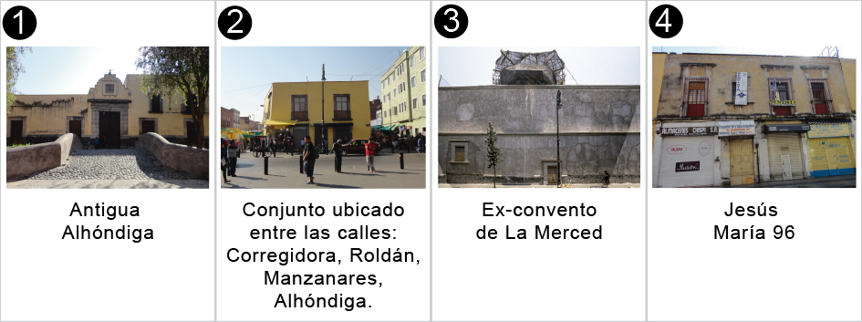 Las edificaciones que conforman la manzana ubicada entre las calles: Corregidora al norte, Plaza Merced al sur, Roldán al oriente y Alhóndiga al poniente componen un conjunto aislado con Nivel de Protección 1; tiene una morfología particular que permite pensar en giros comerciales similares a los de la calle Francisco I. Madero o las inmediaciones de la Alameda Central, y en la recuperación comercial por medio de la peatonización de las calles que lo circundan. En tercer lugar está la Alhóndiga, el edificio ubicado en el número 10 de la calle con el mismo nombre y declarado monumento en 1931: es una edificación antigua que se ha conservado bastante bien y recuerda la herencia comercial asociada históricamente con el barrio.