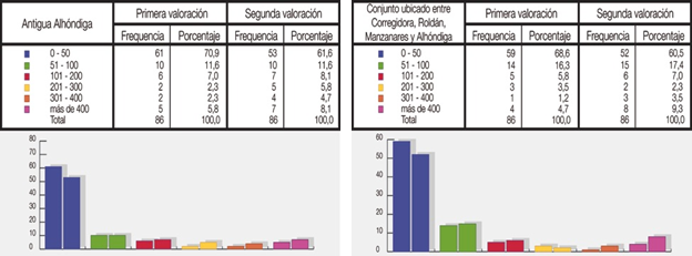 En el caso del conjunto de edificaciones ubicado entre las calles Corregidora, Roldán, Manzanares y Alhóndiga la diferencia entre primera y segunda valoración es similar a los resultados obtenidos para la Antigua Alhóndiga. Del 68,6% de personas que habían indicado que su posible aporte se encontraba entre los 0 y $50 pesos mexicanos por año, cambia al 60,5% y junto con las personas que la asignación de valor en el rango entre 201 y 300 pesos por año -del 3,5% al 2,3% del total de encuestados- son las únicas valoraciones con tendencia a la baja; las demás tienden a incrementarse luego de realizar la explicación, lo que indica que una parte de los encuestados -el 16,3% del total de encuestados- asigna un mayor valor al grupo de edificaciones como consecuencia de la información que reciben (Ver Gráfico 1).