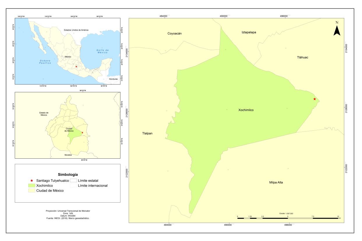 Esta alcaldía está conformada por colonias que se añadieron, a partir de la década de 1960, al complejo entramado existente de 17 barrios y 14 pueblos originarios (figura 2), entre los que se encuentra Santiago Tulyehualco, localizado al oriente de Xochimilco. Tiene una ubicación privilegiada al colindar con dos alcaldías (Tláhuac y Milpa Alta) y ser una ruta de paso hacia Chalco, un municipio del Estado de México; antiguamente era un emplazamiento entre los lagos de Xochimilco y Chalco. La toponimia náhuatl Tulyehualco significa “en los cerros de tule”, una planta acuática utilizada para tejer diversos artículos (Gutiérrez, 2013).