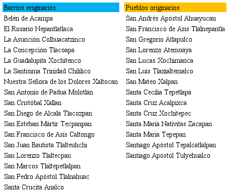 Barrios originarios Pueblos originarios Belén de Acampa San Andrés Apóstol Ahuayucan El Rosario Nepantlatlaca San Francisco de Asís Tlalnepantla La Asunción Colhuacatzinco San Gregorio Atlapulco La Concepción Tlacoapa San Lorenzo Atemoaya La Guadalupita Xochitenco San Lucas Xochimanca La Santísima Trinidad Chililico San Luis Tlaxialtemalco Nuestra Señora de los Dolores Xaltocan San Mateo Xalpan San Antonio de Padua Molotlán Santa Cecilia Tepetlapa San Cristóbal Xallan Santa Cruz Acalpixca San Diego de Alcalá Tlacozpan Santa Cruz Xochitepec San Esteban Mártir Tecpanpan Santa María Nativitas Zacapan San Francisco de Asís Caltongo Santa María Tepepan San Juan Bautista Tlalteuhchi Santiago Apóstol Tepalcatlalpan San Lorenzo Tlaltecpan Santiago Apóstol Tulyehualco San Marcos Tlaltepetlalpan San Pedro Apóstol Tlalnahuac Santa Crucita Analco Importar tabla