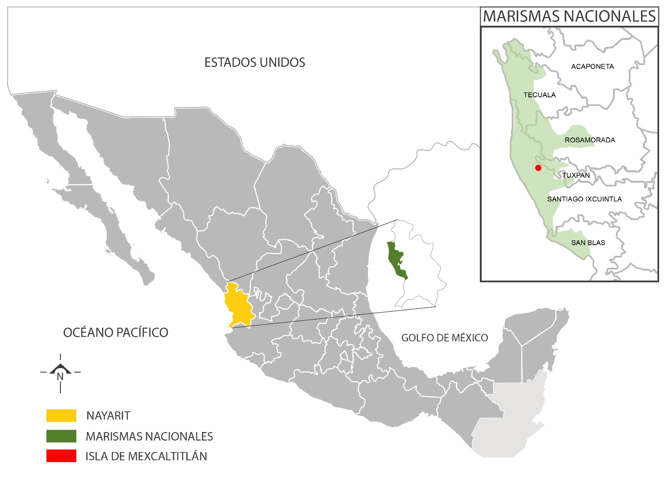 La isla de Mexcaltitán forma parte de un ecosistema estuarino denominado Marismas Nacionales, que tienen un área aproximada de 170,000 hectáreas (Blanco y Correa, 2011, p. 9). Esta zona fue declarada área natural protegida con el carácter de Reserva de la Biosfera[i] y resguarda ecosistemas típicos de la costa de Nayarit; también es hábitat de más de 240 especies de vertebrados y especies de flora endémicas con estatus de amenazadas, sujetas a protección especial o en peligro de extinción (Decreto 5142459, 2010). De tal manera que la isla de Mexcaltitán, así como el contexto natural que la rodea, quedan protegidos por decreto presidencial y al resguardo y cuidado de las dependencias que les confiere.