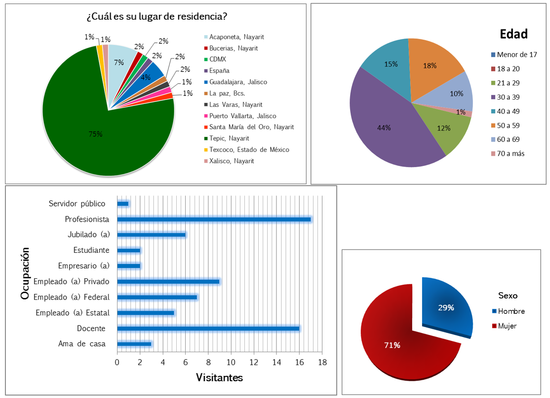 La entrevista está compuesta por un apartado de datos generales como nombre, lugar de residencia, sexo, edad y ocupación (figura 3) y posteriormente de una sección que consta de 28 preguntas que fueron procesadas y analizadas, en las cuales las personas entrevistadas en este caso los visitantes o turistas han expresado su valoración de aceptación o rechazo de los espacios que conforman la isla, así como también la relación estrecha entre la percepción del espacio y el comportamiento que tienen en este a través de sus recorridos. Se abordaron preguntas de percepción sobre el patrimonio arquitectónico que tiene la isla, así como los lugares (inmuebles, espacios, tradiciones) más representativos o con los que se identificaban más, también era importante conocer la opinión que tienen sobre el mito de origen para saber si ese es el principal interés por el cual visitan la isla y sobre el significado de la pérdida del nombramiento de pueblo mágico y finalmente sobre la condición insular de Mexcaltitán.