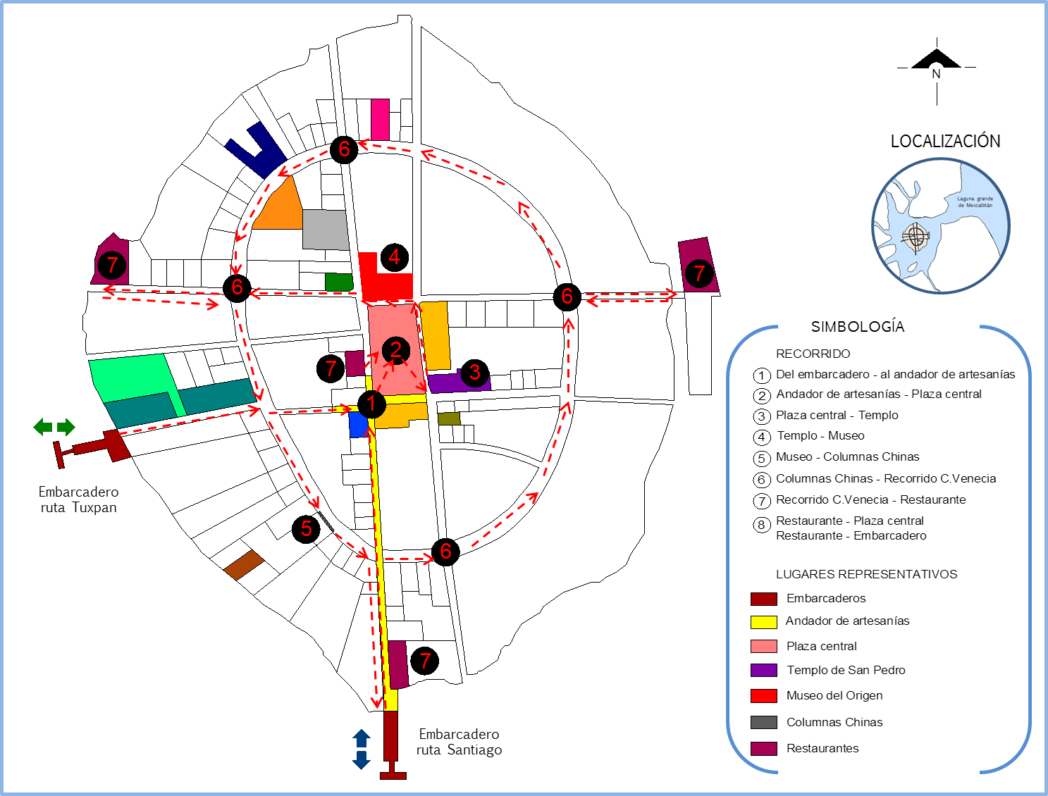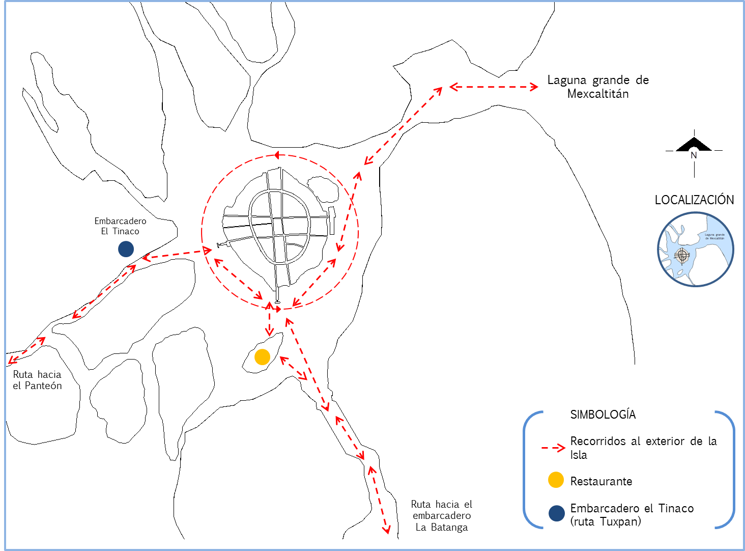 Resultado de la observación directa se logró recabar información sobre los lugares que el visitante y/o turista consideran más importantes, se identificaron las trayectorias tanto al interior como al exterior de la isla, derivado de esa observación se detectó una mayor afluencia de visitantes por el muelle que se ubica al sur de la isla y que conecta con el embarcadero de La Batanga en dirección hacia el municipio de Santiago Ixcuintla. Los turistas entrevistados mencionaban que les era más atractivo llegar por ese lado, ya que los servicios de transporte (lanchas) ofrecen los recorridos por la zona de manglares. Todo lo contrario al embarcadero en dirección al municipio de Tuxpan, que es usado en su mayoría por comerciantes por la cercanía que tiene con la isla, independientemente de cual muelle flotante desciendan los turistas o visitantes, se observó que el primer punto de referencia o de reunión es la plaza central.