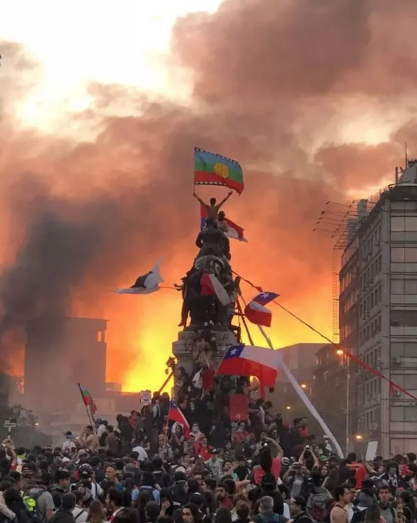 Ainda no contexto da América Latina, os monumentos são heranças de momentos históricos nem sempre emancipatórios. Por exemplo, no caso da capital Santiago no Chile, em protestos durante o ano de 2019, articulados entre estudantes e população nas ruas e praças da capital mostraram que a estátua militar do General Baquedano[iv] foi tomada pela população que elevou, dentre outras bandeiras, a de Mapuche[v] e a do Chile ao topo do monumento (figura 6), simbolizando a luta pela justiça, respeito e liberdade do povo chileno na maior marcha pacífica do país (Lafuente, 2019).