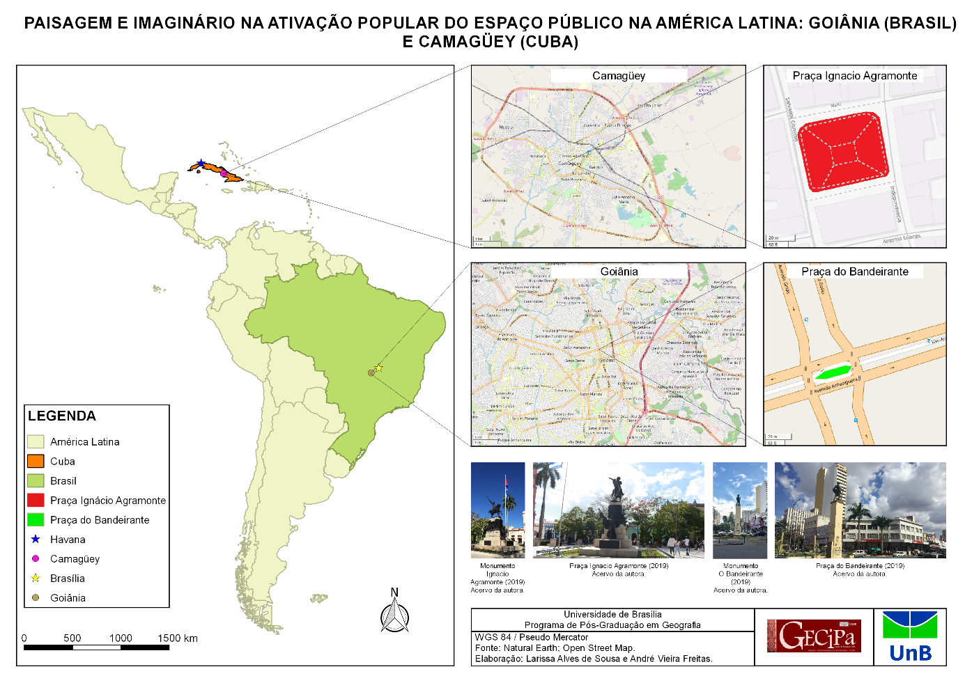 Abstract: This article aims to analyze, from the public spaces of Camagüey (Cuba) and Goiânia (Brazil), the relationship between subjects and monuments. In this sense, the Ignacio Agramonte Square, in Camagüey, is significant in cultural and architectural aspects, as well as demanding the subjects' daily experiences with the heroic figure of the monument to Ignacio Agramonte. Likewise, the formation of Bandeirante Square, in Goiânia, has its essence associated with the political-cultural sphere that emerges from the process of building the city and implies the forms of socialization, therefore, the monument to Bandeirante awakens the interest in understanding the political and/or playful meanings represented by the statue. Methodologically, it is about the popular activation of public space in the light of territorial-heritage, reinforcing this search for the understanding of uses and functions in/of public spaces in Latin American cities and the possibilities in their relations with monuments.