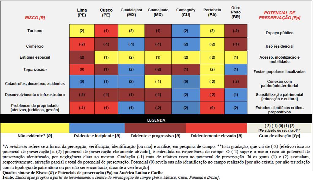O quadro síntese elaborado pelo autor (quadro 1), revela dados importantes sobre a ocorrência dos riscos . e do potencial de preservação patrimonial Pp latino-americano e caribenho. Os resultados da pesquisa elucidam o trato do turismo em cada uma dessas cidades, onde através do empírico, pôde-se chegar a uma análise concreta da carência e da necessidade de conexão espacial da comunidade, pois a ela compete estabelecer o laço afetivo com o território e sua inclusão na gestão de políticas patrimoniais que salientam o potencial do atrativo, e juntos podem criar condições para que se viabilize práticas econômicas alternativas nas cidades da América Latina e do Caribe.