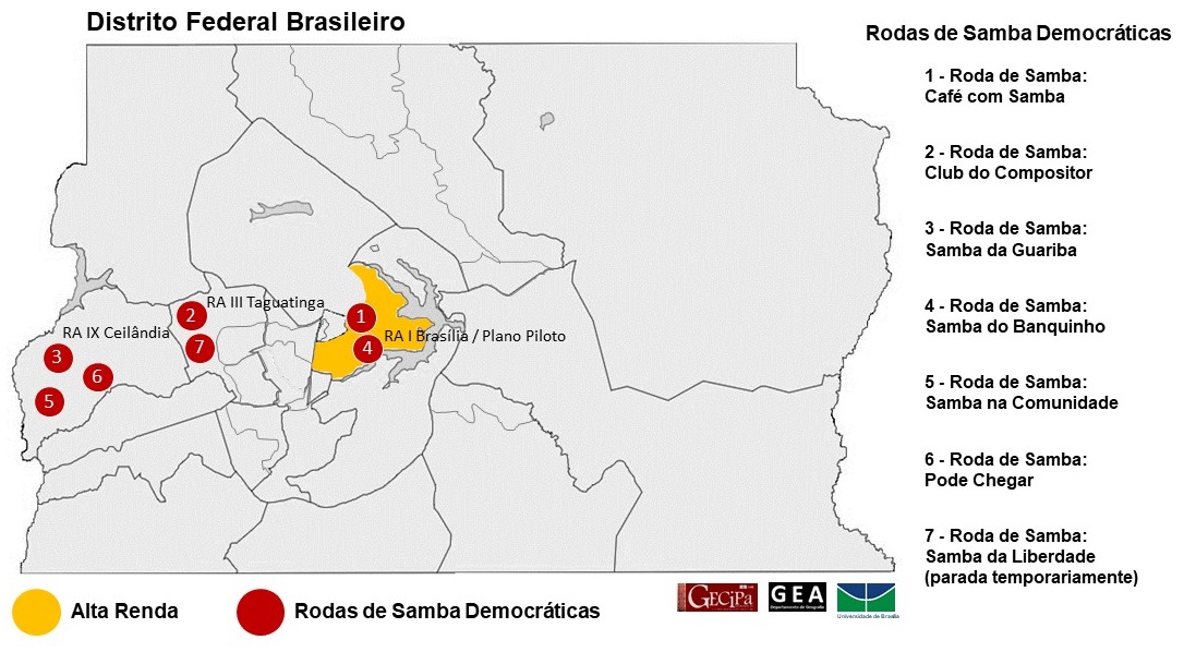 Das 22 (vinte e duas) rodas de samba identificadas e analisadas no Distrito Federal, a partir das redes territoriais de sociabilidade construída por meio de entrevistas participativas e observação participante, foram selecionadas 7 (sete) que carregam as especificidades de “rodas de samba abertas ou democráticas” (Figura 4), ou seja, que se efetivam em espaços públicos de fácil acesso, sem vínculos aparentes com instituições ou empreendimentos comerciais e que resgatam e valorizam o samba autoral de Brasília e o samba de raiz.