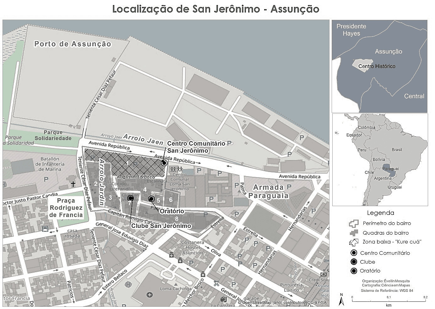 Essa conjuntura nos estimulou a buscar as resistências patrimoniais reproduzidas em símbolos e memórias dos sujeitos subalternizados, mas também em compreender como a razão colonial que rege a patrimonialização impacta e redimensiona essas resistências. Portanto, decidiu-se analisar o bairro Loma San Jerónimo localizado no setor Oeste de Assunção sobre uma de suas sete colinas e inserido na área do tradicional bairro Dr. Garcia de Francia. Nas suas proximidades, estão situadas importantes referências para a cidade, como o Porto de Assunção e instâncias militares, a ver Figura 1, o que culminou na sua anexação na zona de amortecimento do Centro Histórico de Assunção via ordenança municipal nº 267/09, num cenário de projetos urbanos que incidiriam direta e indiretamente no bairro e em seu patrimônio-territorial.