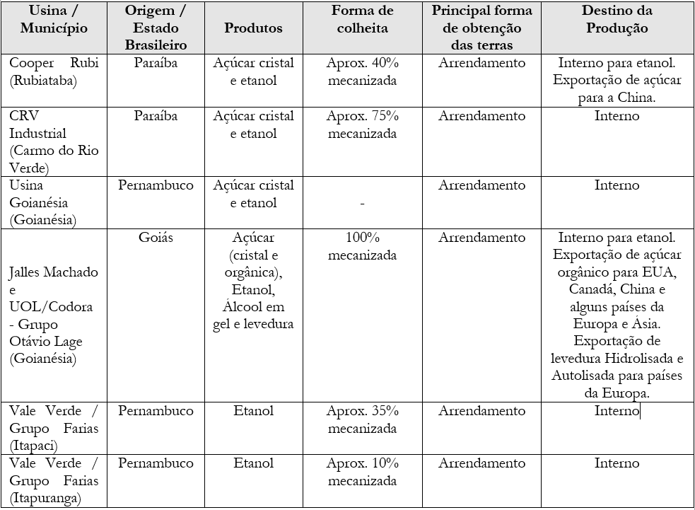 Além disso, destaca-se que as usinas implantadas na microrregião estudada têm em sua maioria capital nacional, tendo somente na usina Jalles Machado, capital internacional. O etanol produzido em todas as usinas abastece o mercado interno e a produção de açúcar é voltada para exportação, sobretudo, a produzida na usina acima mencionada (o quadro 1 mostra os principais detalhes da produção canavieira nas usinas da microrregião Ceres, levantados durante as entrevistas aos empreendimentos da região).