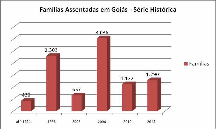 O estado de Goiás seguiu essa tendência, até o ano de 1994 somente 430 famílias tinham sido assentadas. Os dois momentos mais relevantes em Goiás estão relacionados aos primeiros mandatos dos Governos Lula e FHC, respectivamente, com 3.036 e 2.303 famílias assentadas (figura 3). O primeiro mandato do Governo Dilma (2011 - 2014) também seguiu esse declínio. Segundo a Comissão Pastoral da Terra – CPT, foram assentadas 103.746 famílias entre os anos 2011 e 2014, contudo somente 28.313 famílias estão ligadas aos processos de assentamentos originados no Governo Dilma[v]..