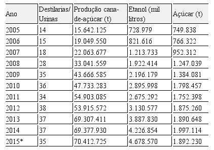 São 35 usinas canavieiras em funcionamento e uma produção aproximada de 70 milhões de toneladas/ano de cana, além de mais de 4 milhões de litros de etanol e mais de 1.8 milhões de toneladas de açúcar produzidas (tabela 1).