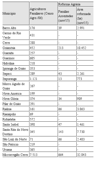 A microrregião Ceres apresentou ao total 664 famílias assentadas, no ano de 2015, o que corresponde a uma área reformada de 32.043 ha. Os dados da tabela 2 representam mais um indício da realidade fundiária da microrregião Ceres e revelam a concentração de terras nas mãos do agronegócio canavieiro e pouco investimento em políticas alternativas às monoculturas, bem como ineficiência em relação à reforma agrária.