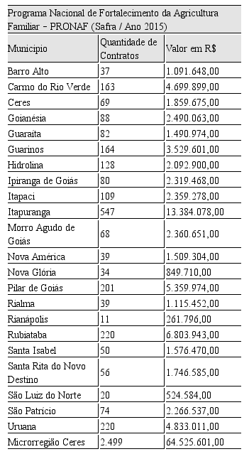 A tabela 3 mostra que no ano de 2015, 2.499 famílias foram contratadas pelo PRONAF na microrregião Ceres, o que corresponde a um valor de R$ 64.525.601,00. Se compararmos aos altíssimos investimentos no agronegócio sucroenergético esses valores se mostram muito pequenos.