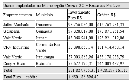 Como um exercício comparativo, pode-se observar os dados do programa Produzir (fomento à industrialização) do estado de Goiás para as usinas sucroenergéticas em funcionamento na região estudada (tabela 4). Enquanto o PRONAF investe cerca de 64 milhões por ano na região (vinte e dois municípios), somente o Produzir investiu mais de 1 bilhão e seiscentos mil reais em investimento fixo e crédito agrícola para a implantação de seis usinas na região.