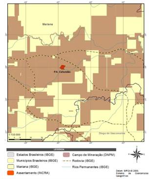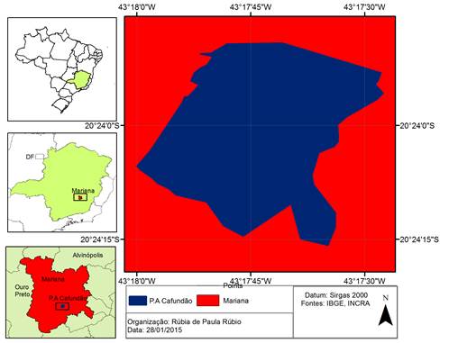 O Projeto de Assentamento de Reforma Agrária Cafundão, localizado no distrito Cachoeira do Brumado do município Mariana (Minas Gerais, Brasil), conforme representado no mapa abaixo (figura 1), possui sua história de luta pautada na validação de pertencimento a tais terras. Essa validação se deu por meio da requisição pela aplicabilidade da Política Nacional de Reforma Agrária, que fora efetivada através da criação do Projeto de Assentamento Cafundão, em 1995. Menos de 10 anos depois da criação do assentamento, em 2002, este fora considerado “consolidado”, o que infere sobre a criação de mecanismos que assegurem a sua reprodução na terra.