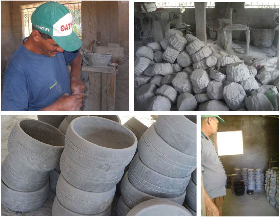 Bem como, a sua produção artesanal de panelas convive com uma produção industrial no mesmo distrito. Segundo o Centro Tecnológico de Minas Gerais (CETEC-MG, 2006), há registradas empresas que trabalham com a lapidação industrial do esteatito há pelo menos 60 anos nesta região. Inclusive, há uma liderança local, ex-vereador por quatorze anos, que possui a sua própria usina de geração de energia, atua na lapidação em fábrica e também na extração de blocos rochosos, produz (para o ano analisado) cerca de duas mil panelas por dia, e ainda investe na expansão turística por meio da internacionalização da pedra-sabão, com investimentos em hotelaria. Ainda segundo o relatório realizado pelo CETEC-MG (2006), há uma tensão criada pelas empresas mineradoras no que concerne à concessão da lavra de esteatito, o que dificulta e encarece as produções artesanais, tal como realizado pelo assentamento Cafundão. Conforme este relatório, o assentamento, que se une numa cooperativa, se defronta com uma tensão pela matéria-prima, que tem sido monopolizada por grandes empresas mineradoras, o que ocasiona o encarecimento dos blocos e a diminuição significativa das vendas aos assentados.