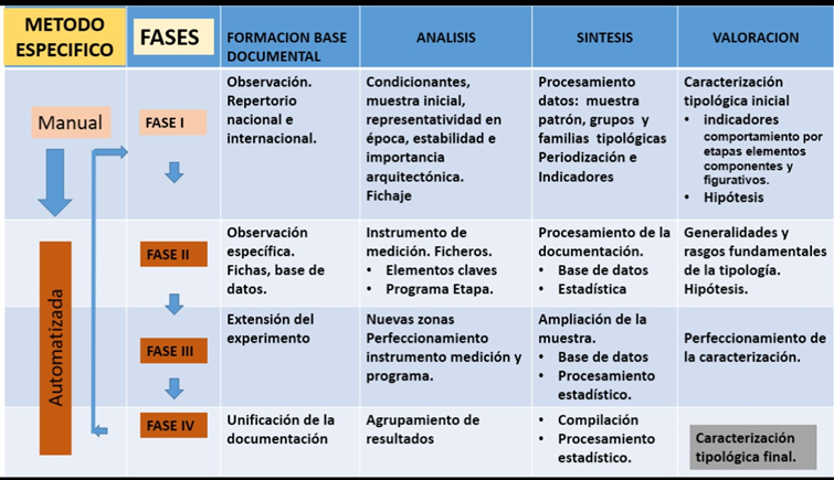 La fase 1(manual) responde al inicio de la investigación de un centro histórico en específico; se retroalimenta del estudio de carácter general sobre tipología (Método General); parte de la observación, medición y experimentación, con el empleo de la documentación existente en archivos (documentos específicos) e incluye además un análisis de cada edificación que contempla representatividad en época, estabilidad e importancia arquitectónica.
