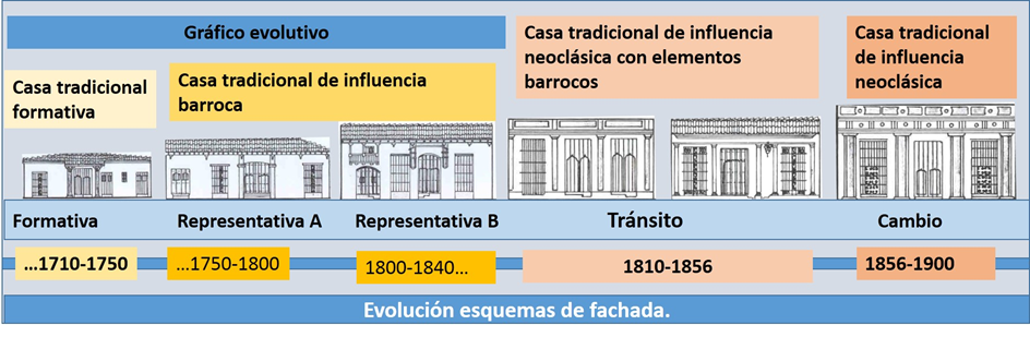 - La mayor transformación en la arquitectura colonial habitacional responde al Periodo de Cambio, donde aparece un tipo de casa evolucionada que incorpora transformaciones principalmente en el orden formal, pero mantiene la conformación espacial y planimétrica heredada del tipo de casa de patio presente en toda la etapa colonial. Las trasformaciones se pueden apreciar en la composición de las fachadas que incorporan la teoría viñolesca en su diseño; la regularidad y esbeltez en los vanos; rejas muy elaboradas en hierro forjado que ocultan las ventanas de tablero y cuarterones neoclásicos; pilastras esbeltas, corridas y distribuidas en toda la fachada; y el entablamento compuesto por frisos trabajados.