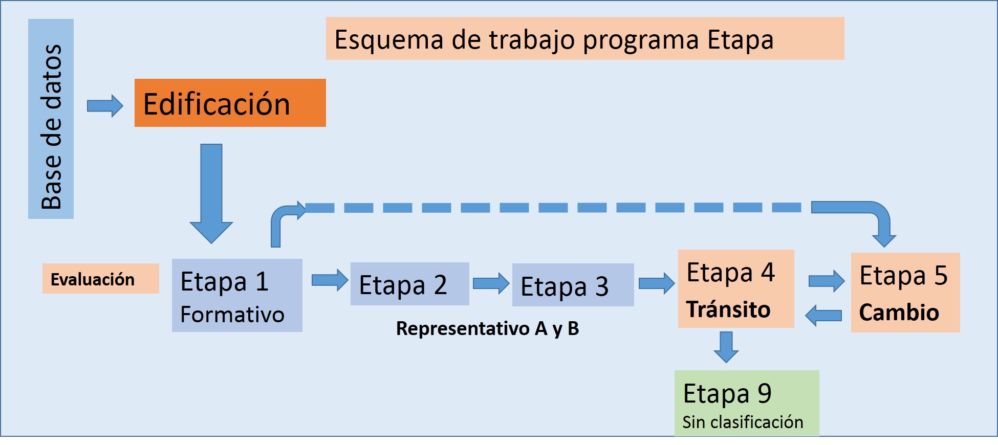 1. Estos elementos se estructuran sobre la base del comportamiento de los ambientes, elementos componentes y figurativos más estables, representativos y de mayor significación dentro de la tipología previamente estudiada en la Fase I. En esta fase se definen variables de trabajo, se estructuran las bases de datos y se realiza un fichaje detallado de la muestra a procesar para poder comparar dichos datos con los ELEMENTOS CLAVES. Ello se produce de forma automatizada mediante el programa ETAPA. Con este programa se obtiene la ubicación de cada edificación en el periodo temporal según las particularidades antes descritas en el gráfico evolutivo.
