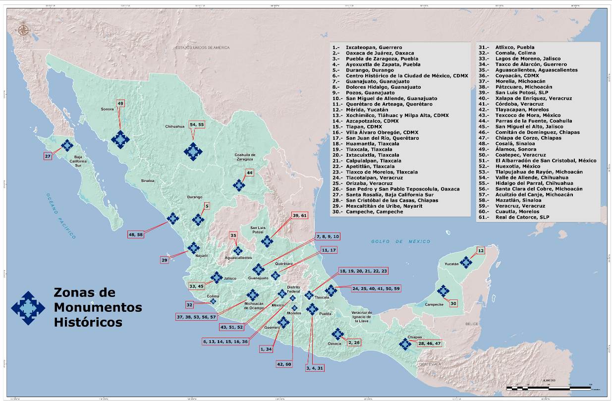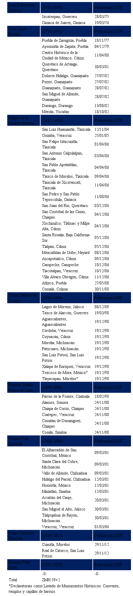 A lo largo de ocho sexenios, de 1970 a 2018, se publicaron 59 declaratorias de ZMH más dos Listados de Monumentos Históricos (Tabla 1). La protección y conservación de las ZMH tiene su base legal en la Constitución Política de los Estados Unidos Mexicanos y desde la década de 1970 involucra varias leyes, principalmente la Ley Federal de 1972, y su reglamento de 1975; la Ley General de Asentamientos Humanos y Ordenamiento Territorial, que data de 1976 (actualizada varias veces, la más reciente en 2016) (DOF, 2016); y la Ley Federal de Fomento al Turismo de 1974 (derogada en 2009 por la actual Ley General de Turismo) (Sectur, 2009). Estas tres leyes concurren directamente en el patrimonio cultural urbano; la primera, enfatiza sobre su investigación, protección, conservación, recuperación y difusión; la segunda, considera el desarrollo urbano de los centros de población, incluyendo preservar sus valores históricos y culturales; y la tercera, busca el aprovechamiento de ese patrimonio cultural como recurso turístico y motor del desarrollo de la economía nacional.