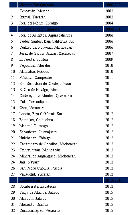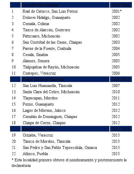 Desde 2001 y hasta antes del Acuerdo de 2014 había 83 nombramientos de Pueblos Mágicos, después de la publicación y hasta 2018, suman ya 121 nombramientos. En el sexenio de Vicente Fox Quesada (2000-2006), la Sectur otorgó 26 nombramientos de Pueblos Mágicos, en el sexenio de Felipe Calderón Hinojosa (2006-2012), 57, y en el de Enrique Peña Nieto (2012-2018), 38. Entre 2001 y 2018 se otorgó un total de 121 nombramientos de Pueblos Mágicos; sin embargo, los nombramientos incluyen 22 localidades con declaratoria y otras 32 con proyecto de declaratoria (Tablas 2 y 3), quedando de la siguiente manera:
