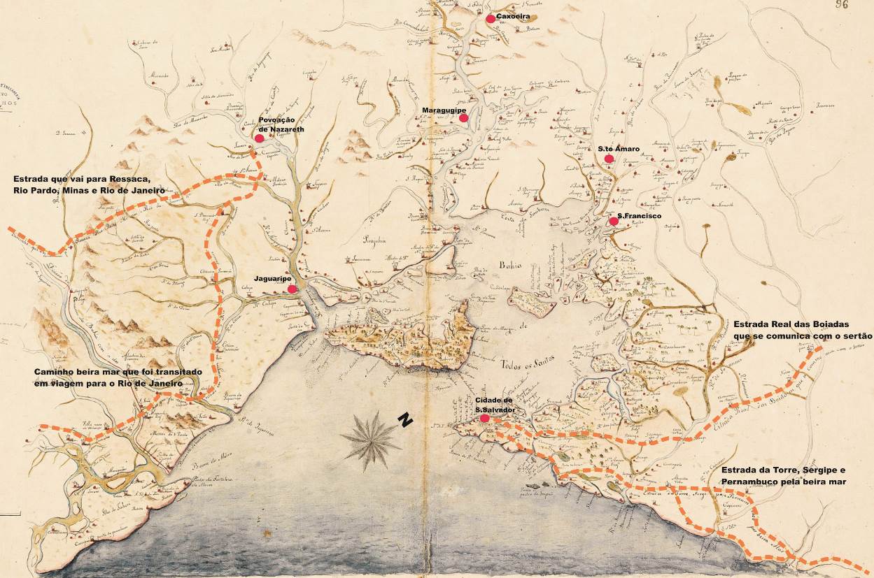 Isso nos leva a questionar a posição de quem faz o mapa e a intencionalidade para qual ele serve, visto que os sertões da Bahia já figuravam como rotas de estradas terrestres que seguiam para as minas e as ligavam à pecuária extensiva das províncias do norte e, principalmente, ao porto de Salvador.