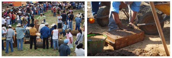 Así, por ejemplo, las maneras de organización que todavía acostumbran algunas comunidades del territorio mexicano, han constituido la estrategia más efectiva para el trabajo. Consiste en realizar actividades compartidas por todos los miembros de una comunidad, para la construcción de una obra destinada a un miembro del grupo o al conjunto de habitantes de una localidad. Cada miembro de la comunidad actúa de acuerdo al dominio que tiene de una técnica específica, por lo que, cada artesano colabora con lo que sabe hacer. Estas actividades compartidas, contribuyen al aprendizaje conjunto y permiten la elaboración de obras que tienen como resultado una amplia integración al contexto ya que, apoyadas en el trabajo conjunto, los ejecutantes toman las decisiones de manera compartida y así las realizan. En la Figura 9 se puede observar la comunidad de Sevina en proceso de organización para el trabajo y, un artesano fabricando adobe para una casa habitación.