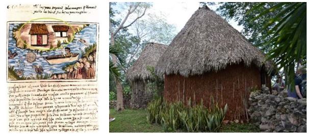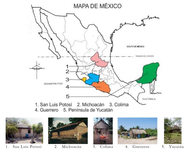 En etapa mesoamericana, las diversas culturas que poblaron el territorio mexicano, tenían costumbres constructivas que estaban permanentemente vinculadas al medio físico geográfico y a las formas de vida de los grupos que habitaban estas regiones. Para dar solución a sus requerimientos de habitabilidad, desarrollaron técnicas sencillas, adecuadas a los sitios para facilitar sus actividades cotidianas. En este medio, la arquitectura que con el tiempo se convirtió en una manera tradicional de construir, fungió como el mejor sistema para cumplir con los requisitos de habitabilidad. En la Relación de Michoacán, las ilustraciones de este documento elaborado en el siglo XVI, muestran la forma y configuración de las viviendas de época anterior a la llegada de los españoles al territorio michoacano (Alcalá, 2000, p. 358). La vivienda maya en la península de Yucatán –como se muestra en la Figura 6 – da ejemplo de soluciones que permanecen en la actualidad y cumplen con las características antes señaladas.
