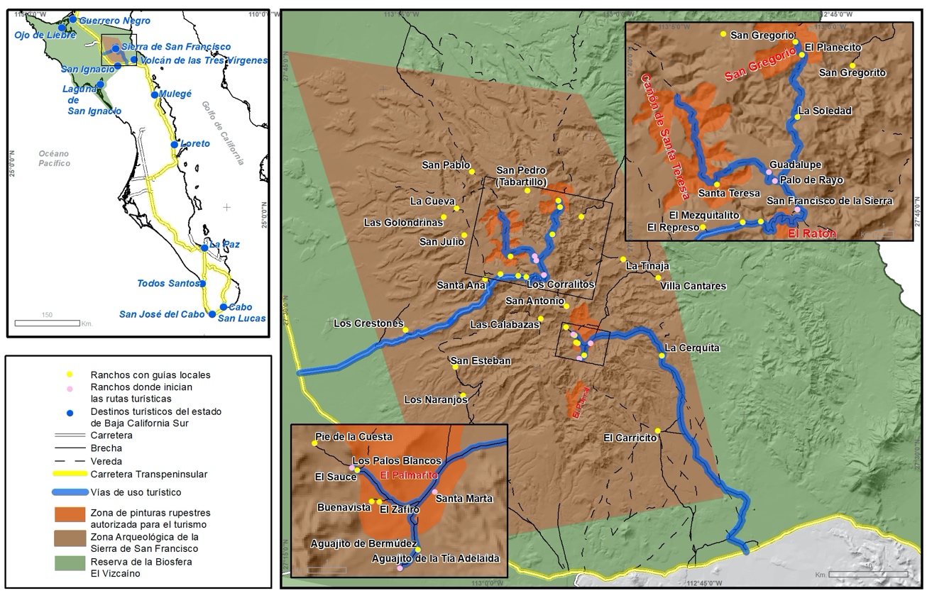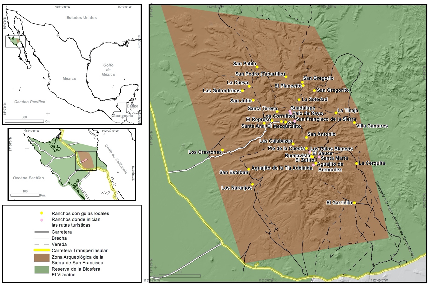 La Sierra de San Francisco es parte de la Reserva de la Biosfera El Vizcaíno, Estado de Baja California Sur, México (fig. 1), en cuyos abrigos rocosos se encuentran las celebérrimas pinturas rupestres Gran Mural y que son Patrimonio de la Humanidad de la UNESCO. El paisaje es desértico y sus actuales habitantes, los rancheros californios, son herederos de la cultura vaquera de la época misional californiana del siglo XVII, expandida posteriormente a los Estados Unidos en la cultura cowboy (Romero & Varela, 2011; Crosby, 2010; Magaña, 2010). El Instituto Nacional de Antropología e Historia [INAH] (1994) estableció en su “Plan de Manejo para la Zona Arqueológica de la Sierra de San Francisco” [Plan de Manejo] el polígono de la “Zona Arqueológica de la Sierra de San Francisco”, donde están los murales rupestres (fig. 1). En la gestión del turismo los rancheros californios fungen como guías.