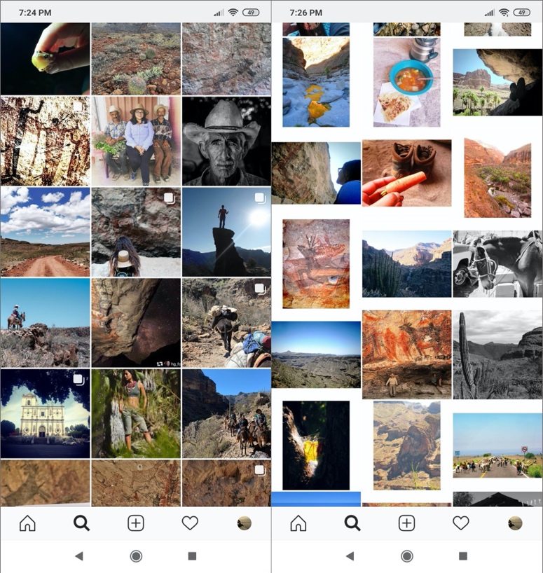 El Plan de Manejo es la parte principal de un “libreto” tácito que redunda en la coreografía de las rutas turísticas a las pinturas rupestres, pues establece las áreas en que los entes involucrados pueden recorrer, las cuevas que se pueden visitar, los espacios de camping, etcétera; de este Plan se derivan los reglamentos para visitantes y guías turísticos que se regulan los comportamientos de los sujetos del turismo; tras “bastidores”, los turistas interesados en ingresar a las pinturas rupestres debe tramitar un permiso en el centro regional del INAH de San Ignacio (al sur de la Sierra de San Francisco), o con los coordinadores de los ranchos San Francisco de la Sierra o Santa Martha (fig. 4); aquí también se debe contratar a un guía ranchero local, cuyo precio se asocia a la dificultad de acceso a los sitios arqueológicos, al número de días de recorrido y el uso de animales de carga (para personas y equipajes). Quienes llegan en turoperadora se evitan hacer estas negociaciones, pero su margen de involucramiento en la vida cotidiana de los rancheros se reduce. Tales turoperadoras se localizan en México (San Ignacio, Guerrero Negro, Loreto, La Paz, Ensenada, Ciudad de México), Estados Unidos (San Diego) y Alemania. En la figura 5 se muestran algunas fotografías de Instagram que ilustran elementos que los turistas incluyen en sus performances estudiados.