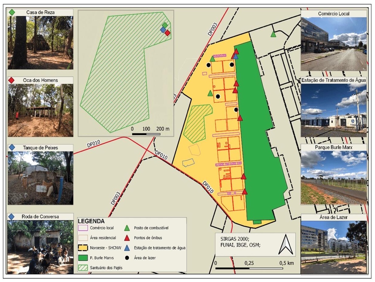 Essa interação se manifesta também na presença de três cemitérios indígenas. Um destes, hoje subposto à área destinada a usos residenciais no Setor Noroeste, ressaltando um aspecto claro da colonialidade expresso por esta pretensa modernidade; os outros dois cemitérios indígenas, por sua vez, estão localizados dentro da delimitação institucional do território, em locais próximos das