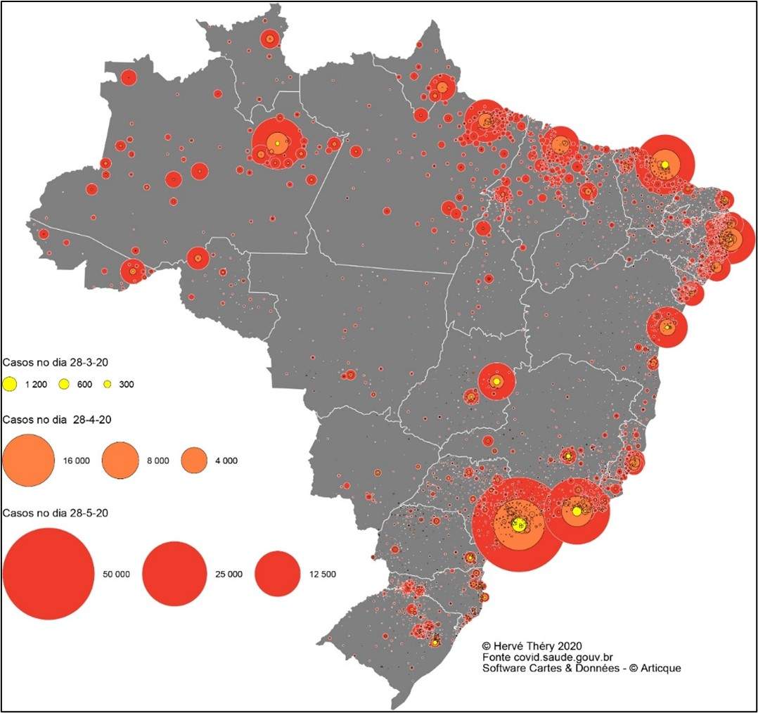 A pandemia da Covid-19 inicia sua difusão em território nacional desde a região concentrada e outros espaços luminosos, “a partir do topo da pirâmide socioeconômica, entre as classes mais privilegiadas” (Alves, 2020, p. 29), tendo em vista a maior densidade de relações estabelecidas entre esses espaços (Guimarães, Catão, Martinuci, Pugliesi & Matsumoto, 2020). Partindo da confirmação do primeiro caso de Covid-19 em fevereiro de 2020, os autores apontam para dispersão da doença a partir das principais metrópoles do país: São Paulo, Rio de Janeiro, Vitória, Brasília, Salvador, Recife, Fortaleza, Belém, Manaus, Curitiba, Florianópolis e Porto Alegre, em diálogo com a espacialização dos casos positivos elaborado por Hervé Théry (2020) (fig. 1), entre os meses de abril a março.
