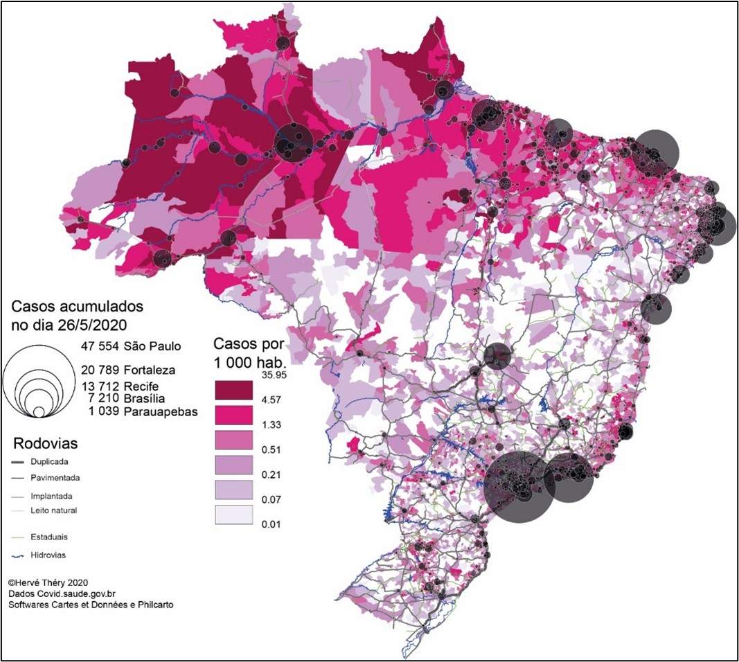 A interiorização da doença e sua dispersão, de acordo com Guimarães et al (2020) e conforme cartografia de Hervé Théry (2020) (fig. 2), processaram-se a partir dos dois principais modais de transporte nacional, as rodovias e as hidrovias, alcançando todo o território nacional, inclusive os espaços opacos. A esse respeito, é conhecido o comportamento do vírus nas áreas de maior precariedade, de forma que “fica claro que o vírus não é democrático, porque afeta de modo mais brutal tais grupos já mais fragilizados e que não dispõem de condições para o isolamento social” (Alves, 2020, p. 29).